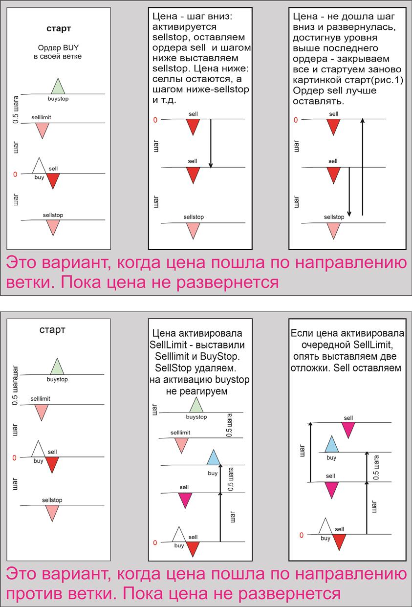 Рост цены для ветки Sell будет постоянно усредняться и жэджироваться. Т.е. ни прибыли не убытка. А для ветки Buy этот рост будет наращиванием лотов в покупку. И наоборот.