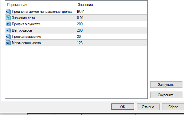 вернее, написать полуавтомат по данному алгоритму. Алгоритм следующий. Ставим на график полуавтомат в удобной для нас ситуации. Он сразу выставляет стоповый ордер по заданным параметрам. Далее возможны два сценария. Если цена пошла в нашу сторону, стоповый ордер активируется и закрывается по заданному тейк профиту. Цикл завершен. Второй сценарий, цена пошла против нас. Через заданный шаг выставляется еще один стоповый ордер по ранее заданным параметрам. И т.д., до тех пор, пока цена не развернется в нашу сторону. Цикл завершается после того, как закроется самый ранний стоповый ордер. После того, как цикл завершен, советник-полуавтомат убирается с графика. Параметры полуавтомата на скриншоте. Если предполагаемое движение цены BUY, полуавтомат выставляет sell stop. Если предполагаемое движение цены SELL, полуавтомат выставляет buy stop.
