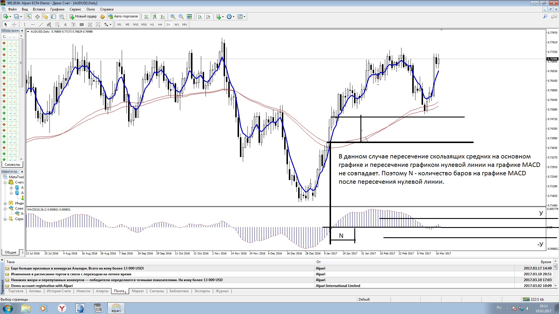 На МАСD бар, на котором произошло пересечение скользящих средних, должен быть не более “N” после пересечения нулевой линии (т.е. в диапазоне 0....N включительно) и не больше значения «У», т.е. в диапазоне 0… У или -У...0 включительно. (значение «У» может быть как положительным, так и отрицательным);