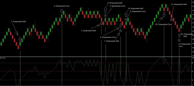 Открытие позиции на Селл: линия индикатора пересекла уровень 80 сверху вниз. Закрытие позиции на Селл: линия индикатора пересекла уровень 50 снизу вверх при этом линия должна побывать ниже уровня 20.