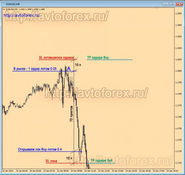 В момент открытия локового ордера мы имеем прибыль в размере 10 пунктов для ордера, закрывшегося по Правилу Сейфа, и 70 пунктов для «оставшегося в рынке» ордера на продажу. Если локовый ордер закроется по стоп-лоссу, «селловский» ордер закроется по тейк-профиту и принесет нам прибыль ещё в 10 пунктов, что в итоге составит 80 пунктов. Итого имеем: