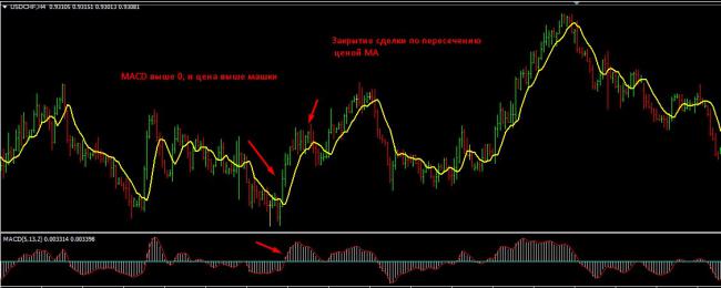 Суть сводится к следующему: Цена находится выше МА и линия MACD выше ноля — бай. Закрытие сделки происходит при пересечении ценой МА.